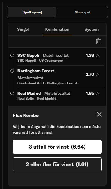 Det är framför allt Flex Kombo som kan behöva en liten introduktion då det inte förekommer hos många sajter. Funktionen låter spelaren bestämma hur många val som måste bli rätt för att vinna. Normalt behöver samtliga val i en kombination vara korrekt för att kamma hem vinst. Med Flex Kombo kan detta justeras.