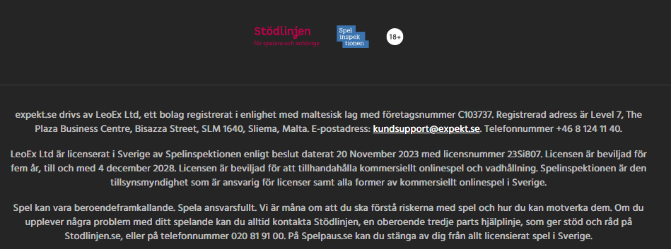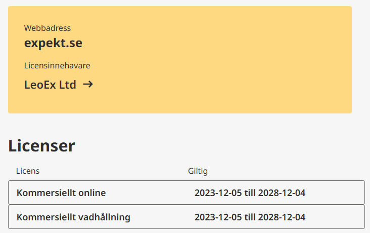 I exemplet ser vi att Expekt har licens för vadhållning (betting) fram till 4 december 2028. Denna process kan man återupprepa för vilket bolag som helst. Får du inte upp något resultat är det troligt att sajten inte har nödvändig licens.