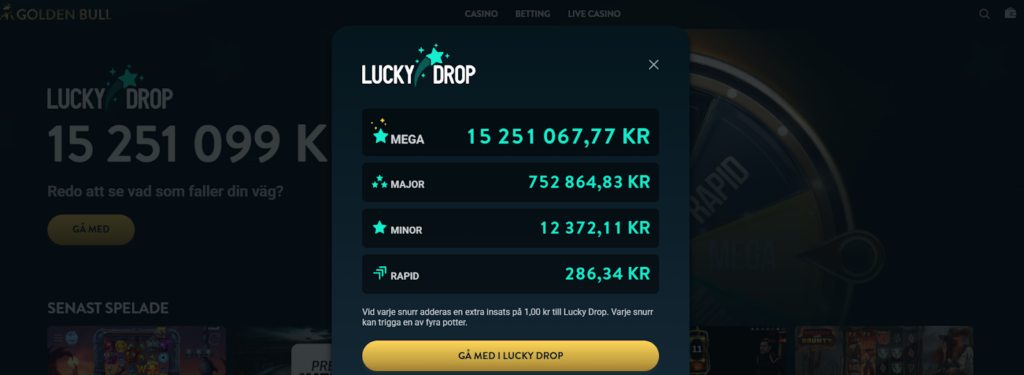 Även Golden Bull Casino har Lucky Drop konceptet där progressiva jackpottar triggas slumpmässigt och utlöser en av Mega, Major, Minor eller Rapid summorna. För att ha chans på de olika jackpottarna behöver man som spelare först trycka på “Gå med i Lucky Drop” och godkänner då en extra insats på 1 krona när du spelar på kvalificerande spel.