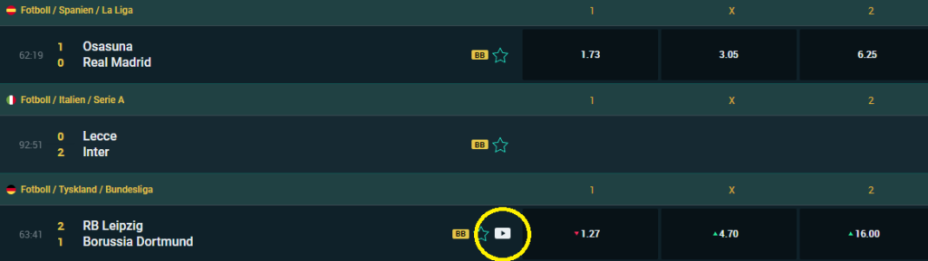 Livebetting är en viktig del av spelupplevelsen och vi kan gå i god för att även den fungerar utmärkt hos spelbolaget. Live streaming finns tillgängligt för vissa evenemang och indikeras i så fall med en video symbol som på bilden nedan.