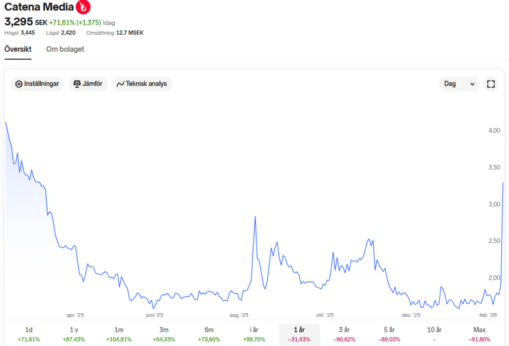 Marknaden reagerade positivt på Catena Medias rapport. I skrivande stund ser vi en kursraket på 70%.