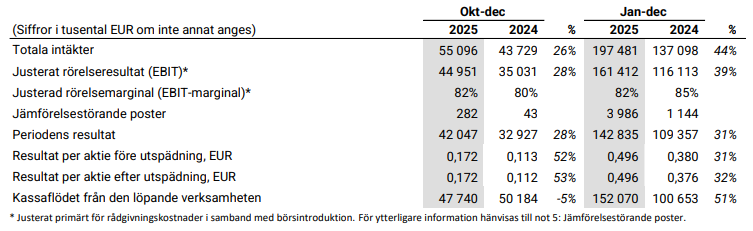 - Omsättning Q4 2025: 55,1 M€ (+26% jämfört med Q4 2024)