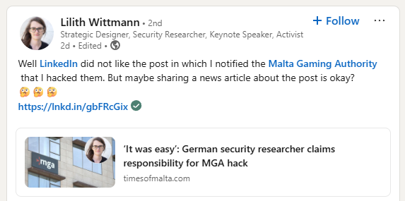 I fredags eskalerade rapporterna om det dataintrång som tidigare under veckan drabbat Malta Gaming Authority (MGA) – Maltas motsvarighet till Spelinspektionen. En tysk ’etisk hackare’ vid namn Lilith Wittmann, gick då ut offentligt på LinkedIn och tog på sig ansvaret för intrånget, samtidigt som hon riktade allvarliga anklagelser mot myndigheten. Enligt henne själv är syftet med intrånget att avslöja kopplingar mellan MGA och organiserad brottslighet.